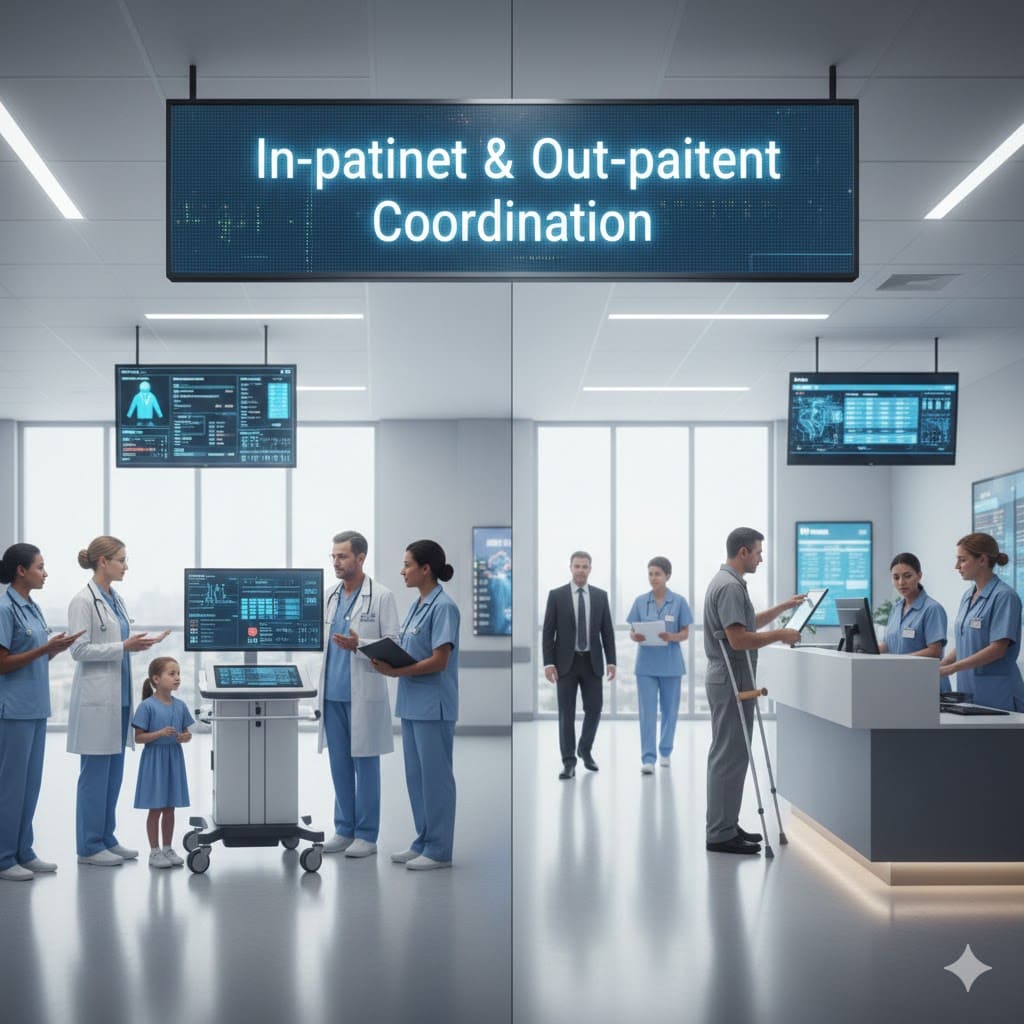 We coordinate end-to-end hospital services for both in-patients and out-patients, including doctor appointments, admissions, diagnostics, discharge procedures, and follow-up care.